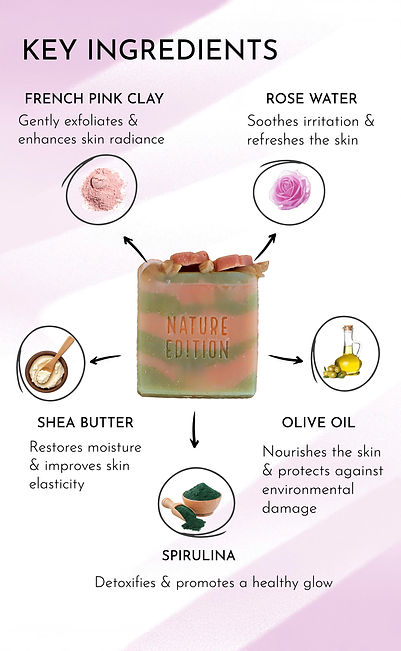 Indulge in the botanical luxury of our Rose & Spirulina Soap, a beautifully crafted bar that combines the delicate essence of rose with the revitalizing power of spirulina. Rose water and rose essential oil provide a soothing, floral experience, while French pink clay gently detoxifies the skin. Enriched with nourishing oils like coconut, olive, and sunflower, along with shea butter, this soap deeply moisturizes, leaving your skin soft and radiant. Spirulina powder adds a boost of antioxidants and vitamins, promoting a fresh, healthy glow. Perfect for a calming and rejuvenating cleanse, this soap is a true treat for your skin.
